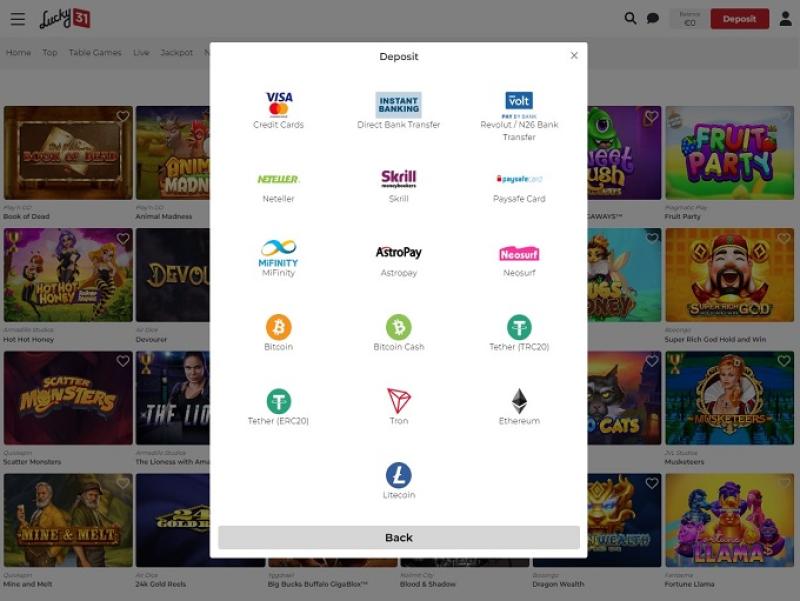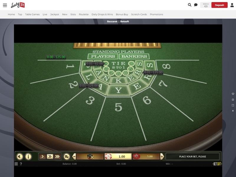 Lucky31 赌场由 Net Entertainment, BetSoft, Evolution Gaming, Habanero Systems, iSoftBet, Oryx, Play'n GO, playson, Quickspin, Relax Gaming, Saucify, Thunderkick, Visionary iGaming, WM, Yggdrasil, Wazdan, GameArt, Booming Games, Stakelogic, Pragmatic Play, Nolimit City, Felt Gaming, Red Tiger Gaming, Booongo, Air Dice, LuckyStreak, Spinomenal, Fantasma Games, SYNOT Games, Revolver Gaming, Spinmatic, BGAMING, Evoplay, Electric Elephant Games, Bulletproof Games, Gluck Games, Mascot Gaming, Spearhead Studios, Swintt, Mancala Gaming, SmartSoft Gaming, Blue Guru Games, Lady Luck Games, Amusnet Interactive, CT Interactive, EveryMatrix, Push Gaming, Genii, Gamomat, Authentic Gaming, 4ThePlayer, AvatarUX, Gamevy, ReelPlay, Japan Technicals Games, Boomerang Studios, Hacksaw Gaming, Max Win Gaming, Bang Bang Games, Slotmill, Peter And Sons, Armadillo Studios, FlipLuck and Indigo Magic提供支持,其赌场游戏通过网页平台提供,用户可在网页浏览器中畅玩。此外,该赌场还提供移动端网站,用户可通过智能手机或平板电脑访问。Baccarat