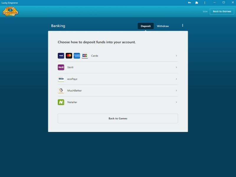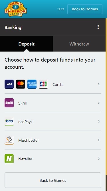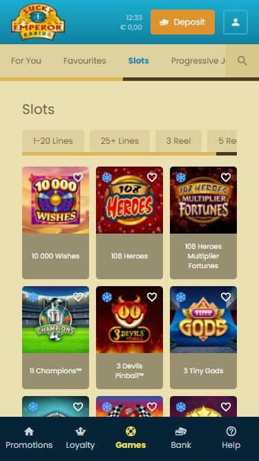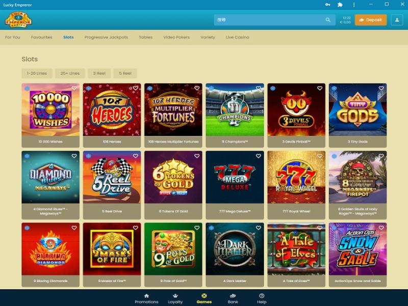 Lucky Emperor Casino 由 Microgaming, Evolution Gaming, Rabcat, Triple Edge Studios, Northern Lights Gaming, Stormcraft Studios, Switch Studios, Electric Elephant Games, All41 Studios, Gameburger Studios, Pulse 8 Studios, Neon Valley Studios, SpinPlay Games, Real Dealer Studios, GONG Gaming, On Air Entertainment, Buck Stakes Entertainment, Games Global, Old Skool Studios, Foxium, Just For The Win, PearFiction Studios, Slingshot Studios, Fortune Factory Studios, Crazy Tooth Studio, Alchemy Gaming, Snowborn Games, Gold Coin Studios, Half Pixel Studios, Eurostar Studios and Aurum Signature Studios提供支持,通过其各种平台提供数百款游戏。您可以通过下载或网页浏览器访问该赌场,选择您喜欢的选项。此外,该赌场还提供移动版本,方便玩家通过智能手机和平板电脑进行游戏。Mac 用户也将直接通过此移动网站进行游戏。Baccarat