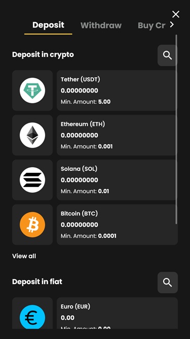 赌场收银员仅提供加密货币支付,但对于尚未过渡到加密货币支付并使用传统银行服务进行在线赌博的玩家来说,这应该不成问题。运营商确保所有赌场访客和注册会员都能通过详细的指南“如何购买加密货币”轻松为账户充值。