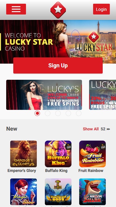 Lucky Star Casino 由 Microgaming, Net Entertainment, Playtech, BetSoft, Amatic Industries, Big Time Gaming, ELK Studios, Espresso Games, Evolution Gaming, Ezugi, Habanero Systems, iSoftBet, Novomatic, Play'n GO, playson, Quickspin, Rabcat, Relax Gaming, Thunderkick, Vivo Gaming, Yggdrasil, Endorphina, Wazdan, GameArt, Betgames, Booming Games, Stakelogic, Pragmatic Play, Nolimit City, Felt Gaming, Red Tiger Gaming, Booongo, Spinomenal, Felix Gaming, Red Rake Gaming, Fugaso, SYNOT Games, Kalamba, Revolver Gaming, Skywind, Triple Edge Studios, Northern Lights Gaming, Fazi, Evoplay, Stormcraft Studios, IGTech, Switch Studios, OneTouch, Bulletproof Games, All41 Studios, Gluck Games, Mascot Gaming, Gameburger Studios, Pulse 8 Studios, Slot Factory, Neon Valley Studios, Golden Rock Studios, SpinPlay Games, GONG Gaming, On Air Entertainment, Buck Stakes Entertainment, Caleta Gaming, Elysium Studios, UP Games, Games Global, Reevo, Amusnet Interactive, Ash Gaming, Blueprint Gaming, CT Interactive, Greentube, Merkur Gaming, ProWager Systems, Push Gaming, Tom Horn Gaming, Mr Slotty, Reel Time Gaming, betiXon, Iron Dog Studio, Old Skool Studios, Foxium, Just For The Win, Reflex Gaming, PearFiction Studios, Wild Streak Gaming, Slingshot Studios, Fortune Factory Studios, AvatarUX, Gamevy, Crazy Tooth Studio, ReelPlay, Alchemy Gaming, Rarestone Gaming, Vibra Gaming, BB Games, Snowborn Games, Boomerang Studios, Hacksaw Gaming, Max Win Gaming, Gold Coin Studios, Bang Bang Games, Gamzix, Half Pixel Studios, Arcadem, Slotmill, Dragon Gaming, Peter And Sons, Eurostar Studios, Lucksome Gaming, Dragoon Soft, Kiron, 3 Oaks Gaming, Amigo Gaming, Wishbone Games, LiveG24, Spribe, Circular Arrow, Print Studios, Elbet, HammerTime Games, INO Games, Nailed It! Games, Neko Games, Reel Kingdom, Oros Gaming and PlayAce提供支持,其游戏通过基于网页的即时游戏平台提供。这意味着您可以直接通过互联网浏览器注册、存款、游戏和取款,无需下载任何软件。此外,它还提供移动端支持,允许玩家通过智能手机和平板电脑存取款。