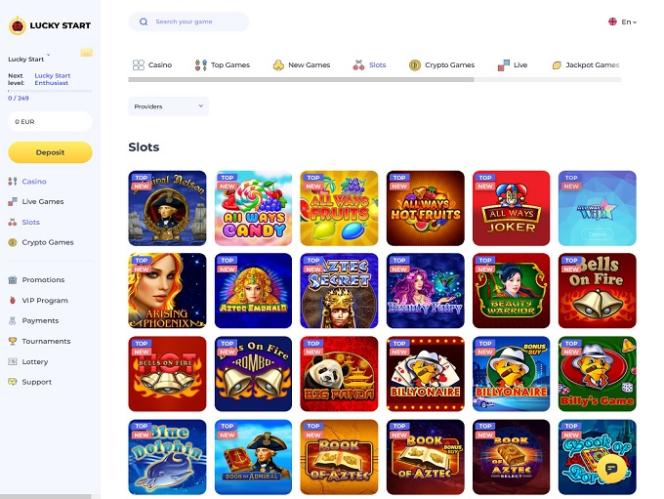 我们一直喜欢简洁直观的网页设计,而这正是 LuckyStart Casino 运营商所追求的。该平台简洁美观,所有内容都清晰简洁。