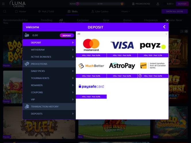 Banking银⾏业务选项 的 Luna Casino