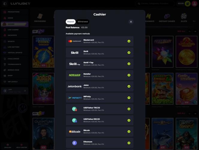 Lunubet Casino 提供丰富的传统和加密货币支付方式,满足全球玩家的需求,并提供多种可用货币。对于加密货币玩家,可选货币包括BTC、DOGE、ETH、LTC、SOL、TRX、USDC、USDT等。