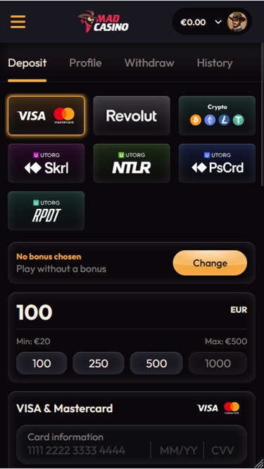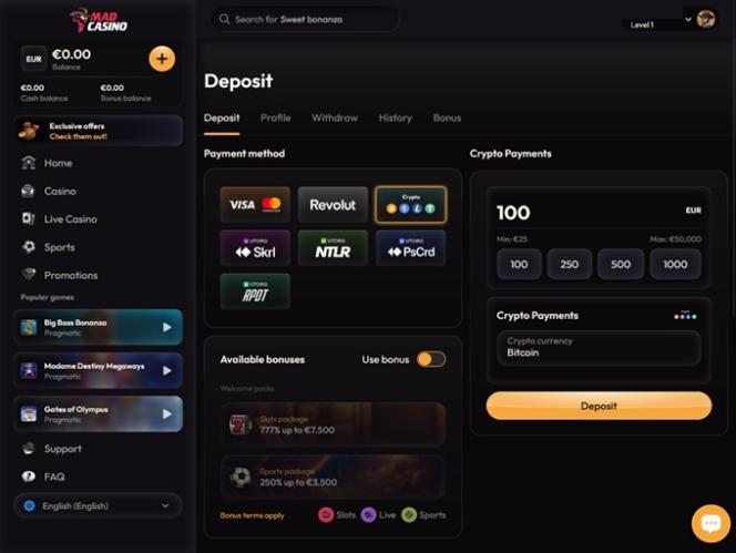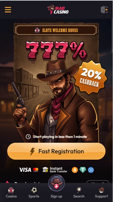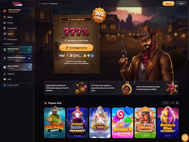 虽然我们可能没有关于忠诚度福利或VIP计划的具体信息,但我们清楚地知道,如果玩家选择Mad Casino作为他们的首选博彩网站,他们将获得哪些类型的促销和奖金。首先,每个新加入赌场的账户都可以领取一份迎新礼包,其中包含面向体育博彩玩家和赌场玩家的存款匹配优惠。