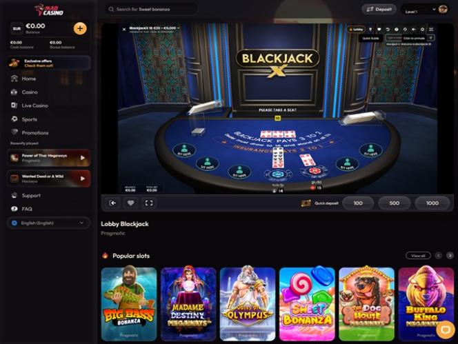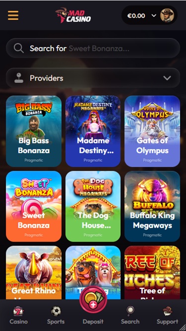 当然,我们还必须提到,玩家可以选择在数十种不同的体育和电子竞技赛事上投注,因为Mad Casino设有一个完全独立的体育博彩专区。体育博彩内容极其详尽,并具有优惠的赔率和实时投注功能。