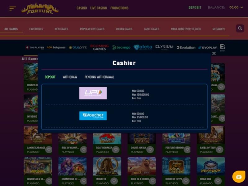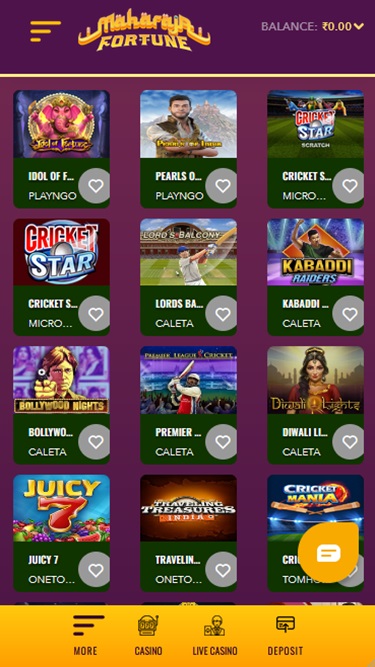 让我们来看看印度游戏部分的一些游戏:Idol Of Fortune、Rich Wilde and the Pearls Of India、Cricket Star Scratch、Cricket Star、Lords Balcony、Kabaddi Raiders、Bollywood Nights、Premier League Cricket、Diwali Lights、Juicy 7、Traveling Treasures India、Cricket Mania、Andar Nights、Ganesha Boost Hold and Win、Namaste Roulette、Cricket War……