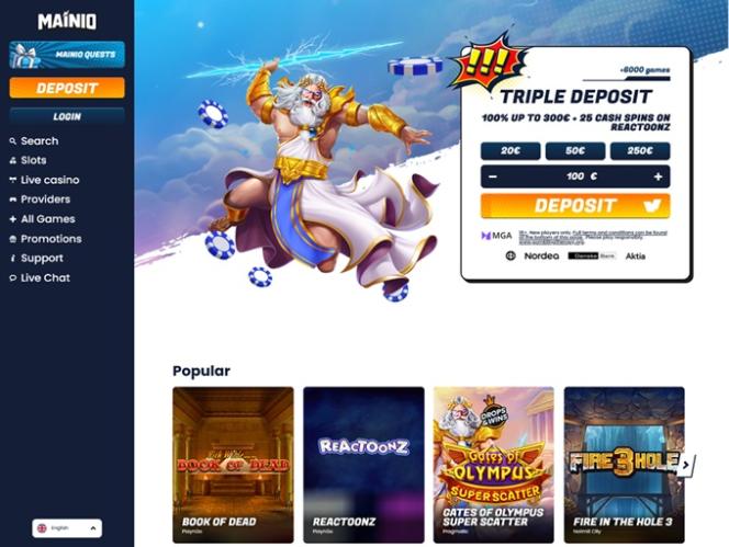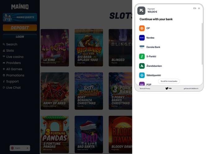 Mainiokasino于2025年上线,是一家专注于为玩家提供丰富多样的赌场游戏的在线赌场,包括数千款在线老虎机、真人荷官游戏、桌面游戏和即时游戏。该品牌主要面向芬兰玩家,并诚邀他们体验所有游戏、参与各种促销活动和赢取丰厚奖金。
