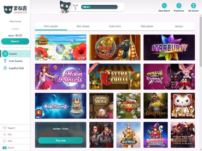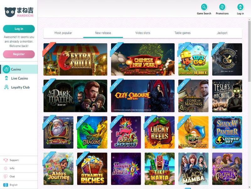 Manekichi 拥有令人印象深刻的老虎机游戏库,提供超过 900 款来自 Microgaming、NetEnt、Yggdrasil、Play'n GO 等品牌的游戏。游戏功能丰富多样,您还可以赢取大型累积奖金,例如 NetEnt 的 Mega Fortune 和 Microgaming 的 Major Millions。此外,还提供移动端老虎机游戏。