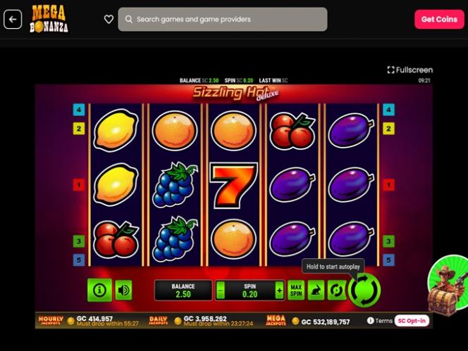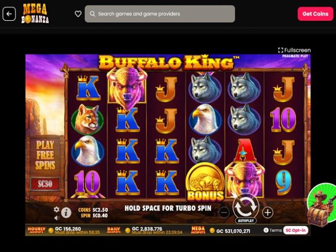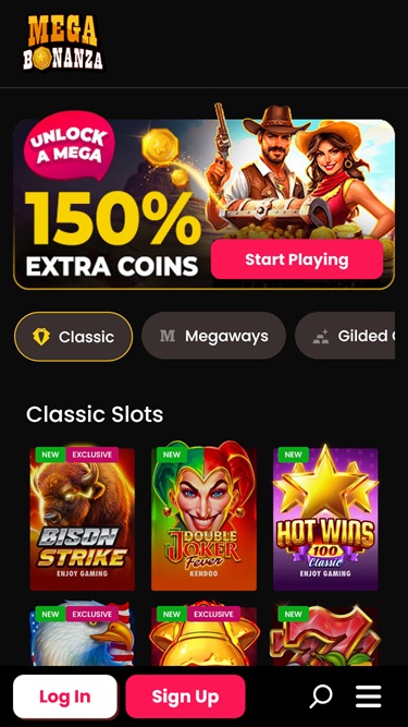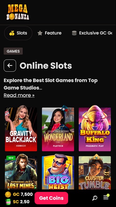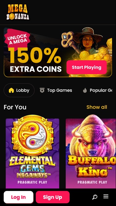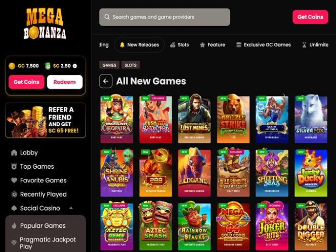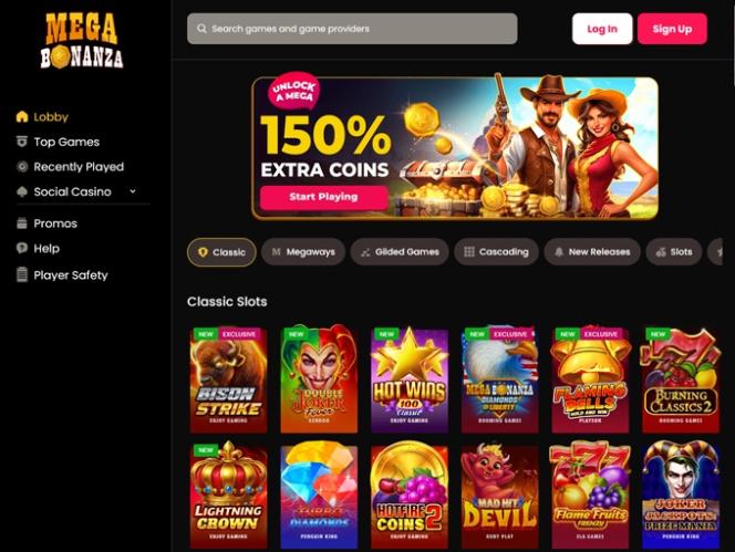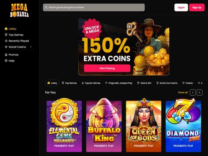 MegaBonanza 是一个带有抽奖元素的社交游戏网站,主要面向美国玩家(部分受美国限制的州),提供丰富多样的赌场游戏选择,包括在线老虎机、真人荷官游戏,甚至还有几款 Slingo 游戏。玩家可以享受各种促销活动、奖金和累积奖金,还可以参加锦标赛赢取金币和抽奖币。
