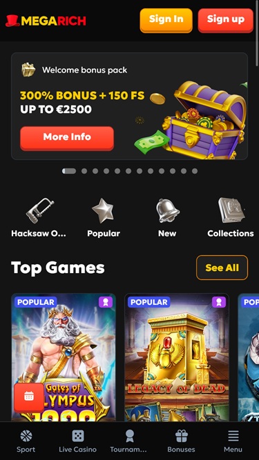 一打开网站,您就会看到一个现代化、高品质的界面,导航便捷。屏幕左上角是游戏、体育、促销和真人娱乐场的标签页,方便您快速切换。账户设置和存款功能则位于右侧。向下滚动网站,您会看到热门和最新的老虎机游戏、精选体育赛事、促销活动,以及近期获奖者的排行榜。