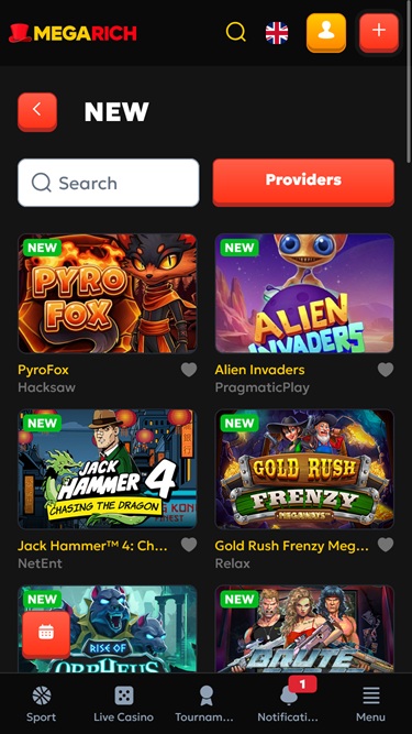 但是,如果您已经知道要查找的游戏名称,或者知道您喜欢的软件提供商的游戏,页面顶部会显示搜索栏,您可以在其中输入您要查找的老虎机游戏名称或提供商。此外,还有一个“提供商”按钮,您可以在这里找到所有可用的提供商。