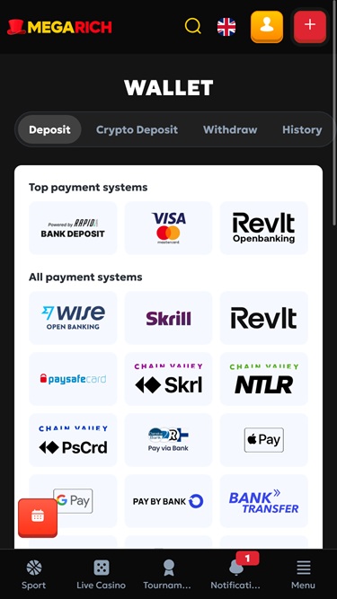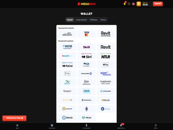 正如我们之前提到的,Megarich 赌场也接受加密货币作为有效的支付方式。这意味着除了Visa 、Mastercard、Skrill 和 Neteller 等最常见的支付选项外,您还可以使用比特币、以太坊、莱特币和狗狗币等货币。