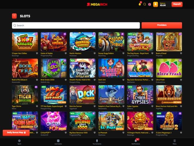 正如我们之前提到的,Megarich 赌场提供来自众多知名供应商的丰富老虎机游戏。Amusnet Interactive、Spinomenal、 Betsoft 、Quickspin、Evoplay Entertainment、 Red Tiger Gaming 、Stakelogic 和 Play'n GO 等众多知名品牌的游戏,您都能畅玩。