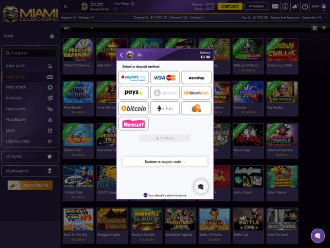 迈阿密俱乐部提供积分系统,可支付网站上所有真钱投注。玩家每在游戏中累积1,000积分,即可兑换1.00美元真钱。赌场积分系统最低提现额度为2,000积分,而且积分累积可能需要很长时间,这意味着您可能需要玩一段时间才能兑换积分。所有积分必须至少投注一次才能兑换。