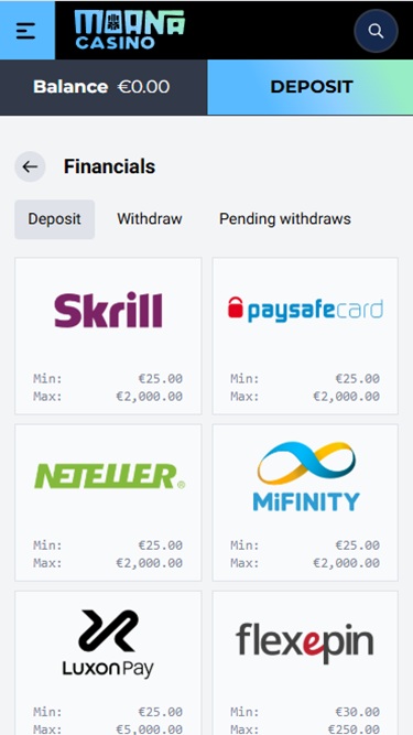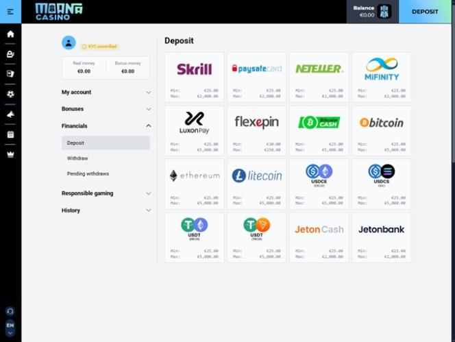 在支付方式方面,玩家可以使用多种方式提取和存入资金,包括银行电汇、 Google Pay 、 Apple Pay 、 Skrill 、 Neteller 、 Paysafecard 、 MiFinity和Neosurf 。玩家可以使用比特币、比特币现金、以太坊、莱特币、泰达币和USD Coin等加密货币管理资金。