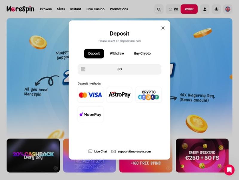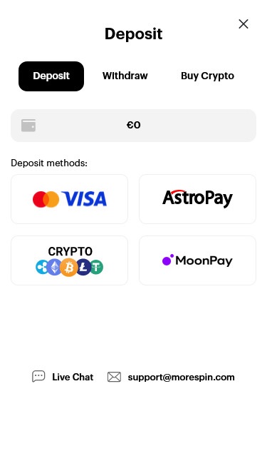 在 MoreSpin 赌场,您可以选择 Visa、MasterCard、AstroPay 和其他电子钱包等热门银行服务。运营商还允许玩家使用加密货币进行存款和取款。