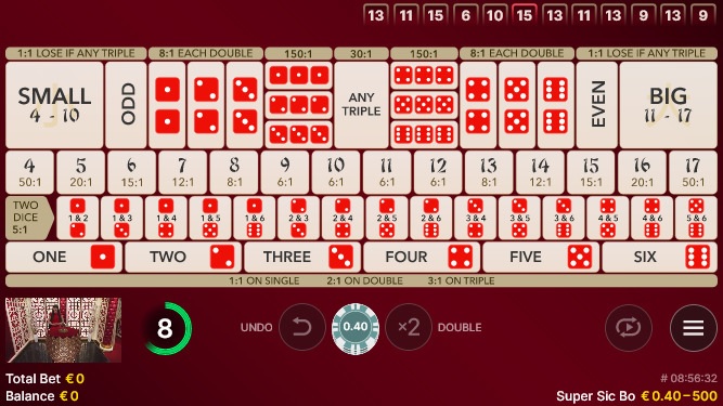 这是⼀种简化版的Sic bo骰宝。两种游戏都是摇出三颗骰⼦, 玩家押注⾄ 少出现⼀次的骰⼦点数。押中⼀颗⽀付1⽐1的赔率, 押中两颗⽀付2⽐1的 赔率, 押中三颗⽀付3⽐1的赔率。 Sic bo骰宝也提供相同的押注, 不过押 中三颗同点数⽀付12⽐1的赔率。