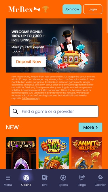 该赌场提供了一个精美的平台,采用明亮的模式设计,拥有精美的字体和大量鲜艳的橙色细节。左侧边栏布局在界面中央区域留出了充足的可用空间,可用于显示促销滑块、游戏以及所有其他赌场信息。氛围非常优雅,我们完全可以说, Rex先生真是个真正的绅士!