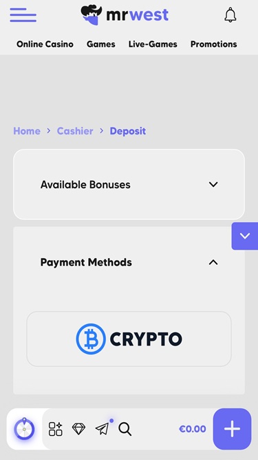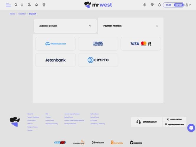MrWest Casino 是一个接受各种银行支付方式的博彩网站,包括传统和现代支付方式。玩家可以使用Visa 、 Mastercard 、 Skrill 、 Neteller 、银行电汇、 Payz和Paysafecard进行存款和取款,同时还可以使用多种加密货币,例如比特币、比特币现金、卡尔达诺、狗狗币、以太坊、莱特币、泰达币和瑞波币。