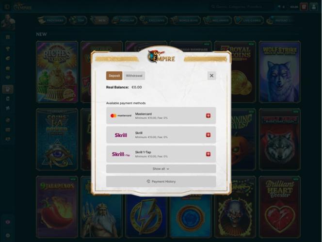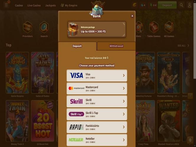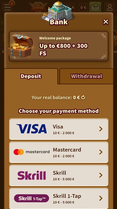 MyEmpire 的收银员支持多种支付方式,以满足玩家的需求。您可以选择Neteller 和 Skrill等常用的电子钱包、支付卡、加密货币银行选项以及其他在线支付系统: