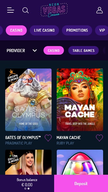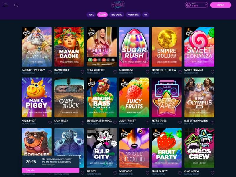 NeonVegas 赌场由 Microgaming, Net Entertainment, BetSoft, 1x2gaming, Big Time Gaming, ELK Studios, Evolution Gaming, lightningboxgames, Oryx, Play'n GO, playson, Quickspin, Rabcat, Relax Gaming, Yggdrasil, Wazdan, Booming Games, Pragmatic Play, Nolimit City, Felt Gaming, Red Tiger Gaming, Fantasma Games, FunFair, Kalamba, Spin Games, Triple Edge Studios, Northern Lights Gaming, Stormcraft Studios, Switch Studios, OneTouch, Electric Elephant Games, Pocket Games Soft, Bulletproof Games, All41 Studios, Gluck Games, Gameburger Studios, Pulse 8 Studios, Neon Valley Studios, Golden Rock Studios, Spearhead Studios, Swintt, SpinPlay Games, HungryBear Gaming, Real Dealer Studios, Blue Guru Games, Buck Stakes Entertainment, Elysium Studios, Games Global, 2by2 Gaming, bluberi, EveryMatrix, Push Gaming, Gamomat, Bally Wulff, Iron Dog Studio, Foxium, Just For The Win, Reflex Gaming, Storm Gaming Technology, PearFiction Studios, Wild Streak Gaming, Slingshot Studios, Golden Hero, Fortune Factory Studios, RubyPlay, 4ThePlayer, AvatarUX, Gamevy, Crazy Tooth Studio, ReelPlay, Japan Technicals Games, Alchemy Gaming, Black Pudding Games, Snowborn Games, Boomerang Studios, Hacksaw Gaming, Max Win Gaming, Gold Coin Studios, Bang Bang Games, Half Pixel Studios, Arcadem, SilverBack Gaming, Peter And Sons, Eurostar Studios, Aurum Signature Studios, Armadillo Studios, FlipLuck, Area Vegas, Leap Gaming, Wishbone Games, Spribe, Print Studios, Gaming Corps, HammerTime Games, INO Games, Nailed It! Games, Atomic Slot Lab, Neko Games, Reel Kingdom, Oros Gaming, JVL, Indigo Magic and NowNow Gaming提供支持,网站游戏通过网页平台提供,浏览便捷,画面赏心悦目。支持移动端游戏,方便您在手机或平板电脑上畅玩。Baccarat