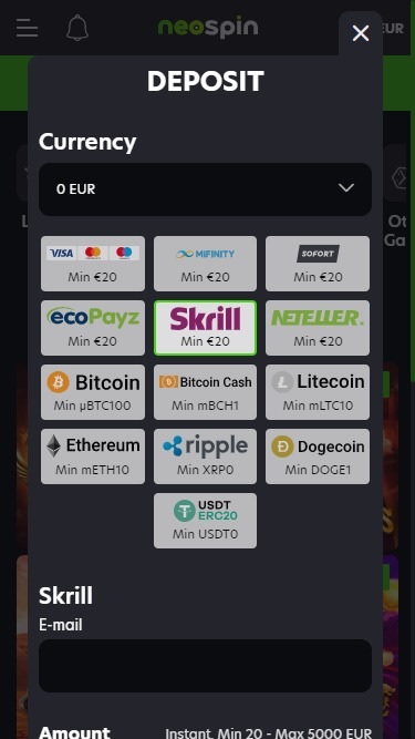 Banking银⾏业务选项 的 neospin Casino