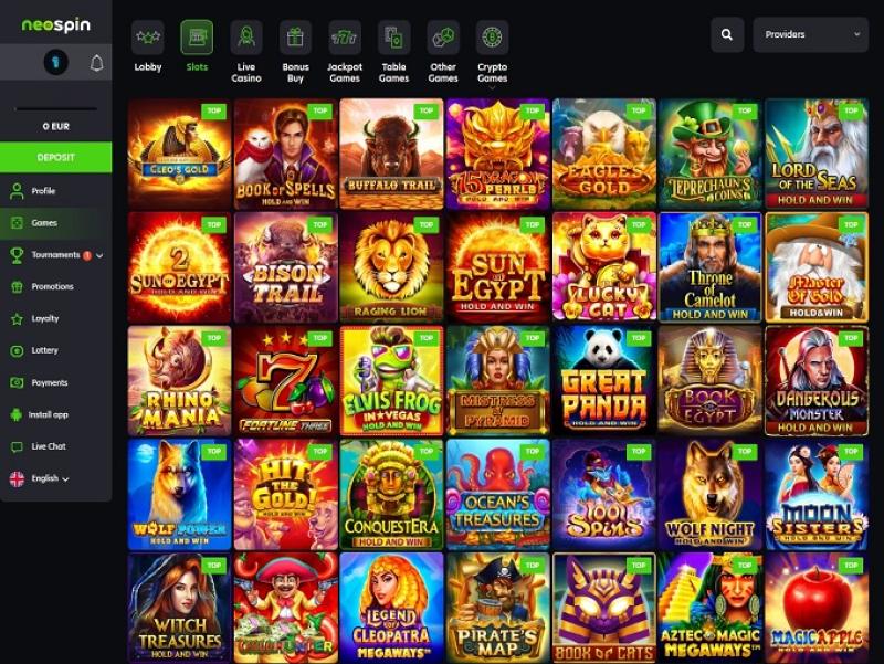 Neospin 赌场提供丰富的在线老虎机游戏。推荐游戏包括:Cleo's Gold、Book Of Spells、Buffalo Trail、15 Dragon Pearls: Hold and Win、Eagle's Gold、Leprechaun's Coins、Lord Of The Seas、Sun Of Egypt 2、Bison Trail、Raging Lion、Sun Of Egypt、Lucky Cat、Throne Of Camelot、Master Of Gold、Rhino Mania、Fortune Three、Elvis Frog In Vegas、Mistress Of Pyramid、Great Panda: Hold And Win、Book Of Egypt、Dangerous Monster、Wolf Power: Hold And Win 和 Hit The Gold!持有即赢、征服时代、海洋宝藏、1001 次旋转、狼之夜、月亮姐妹:持有即赢、女巫宝藏、辣椒猎人、埃及艳后传奇 Megaways、海盗地图、猫之书、阿兹特克魔法 Megaways、魔法苹果:持有即赢、黄金猎人、88 疯狂财富、小丑硬币:持有即赢、水晶挖掘机、虎爪、水牛力量持有即赢、四颗幸运钻石……