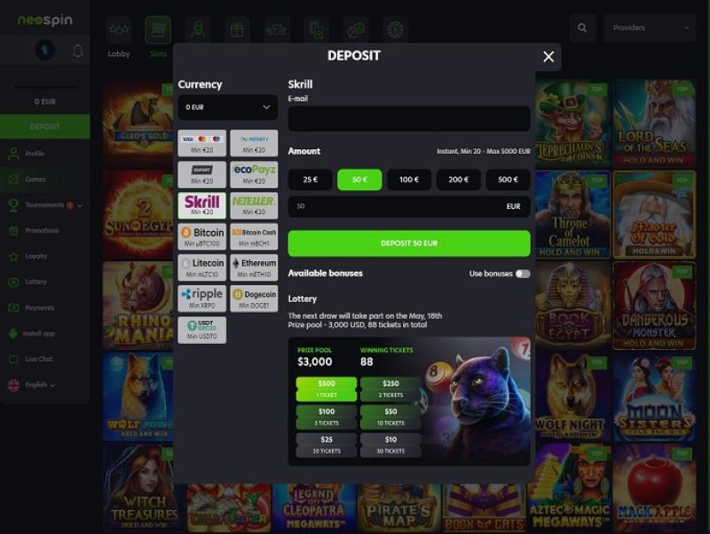 Neospin 是一家在线赌场,由 Hollycorn NV 运营和拥有,该公司根据库拉索法律成立,由 Antillephone NV 许可和监管