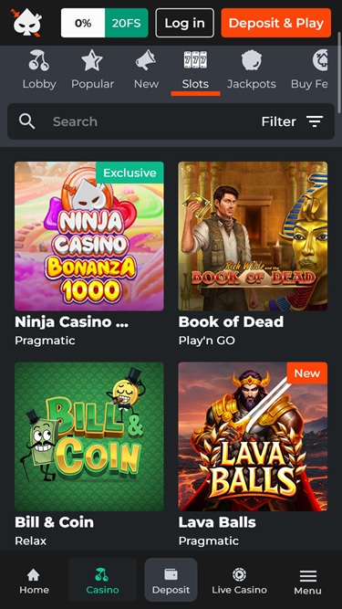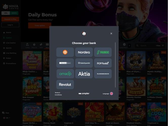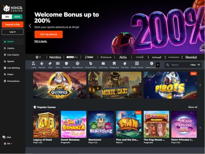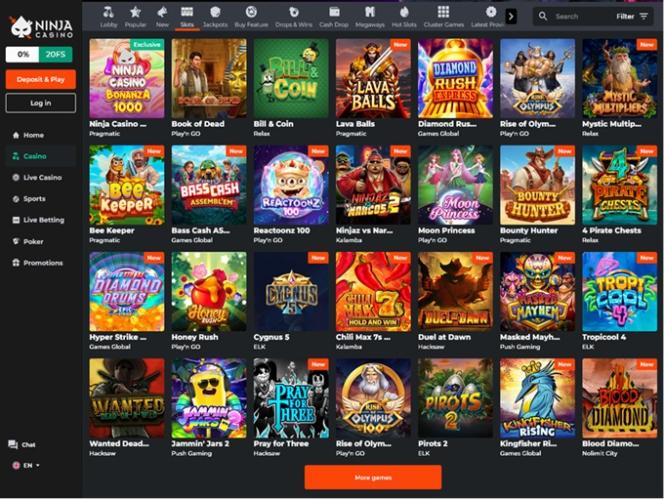 Ninja Casino 与 NetEnt、 Play'n GO 、Microgaming、Yggdrasil 等知名游戏提供商合作,提供各种游戏。除了老虎机和累积奖金,玩家还可以找到各种桌面游戏和纸牌游戏(轮盘赌、百家乐、二十一点、掷骰子、扑克),以及真人荷官游戏。此外,还为体育和现场投注爱好者设有专属专区,涵盖足球、乒乓球、排球等众多体育项目。Baccarat
