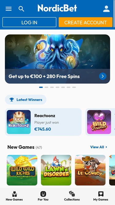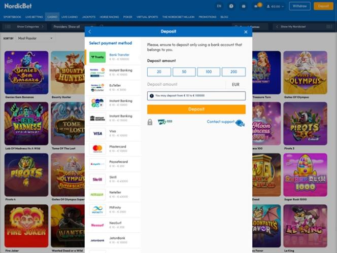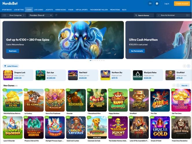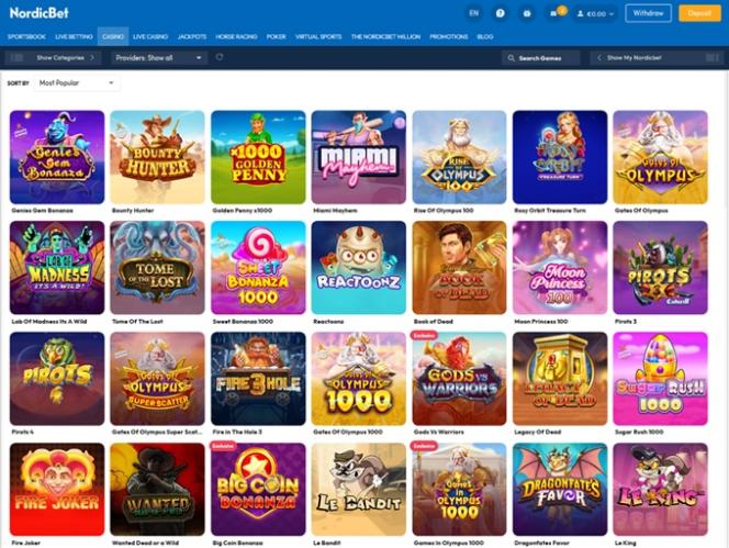 NordicBet Casino 由 Microgaming, Net Entertainment, Playtech, 1x2gaming, Barcrest, Big Time Gaming, ELK Studios, Evolution Gaming, EYECON, iSoftBet, lightningboxgames, Novomatic, Oryx, Play'n GO, playson, Quickspin, Relax Gaming, Thunderkick, Yggdrasil, Endorphina, Wazdan, Realistic Games, Betgames, Booming Games, Stakelogic, Pragmatic Play, Nolimit City, Red Tiger Gaming, IGT, Fantasma Games, SYNOT Games, Kalamba, Triple Edge Studios, Northern Lights Gaming, Evoplay, Stormcraft Studios, Switch Studios, Bulletproof Games, All41 Studios, Gluck Games, Gameburger Studios, Pulse 8 Studios, Neon Valley Studios, Golden Rock Studios, Swintt, Shuffle Master, SpinPlay Games, HungryBear Gaming, SmartSoft Gaming, Blue Guru Games, On Air Entertainment, Buck Stakes Entertainment, Games Global, Reevo, Wizard Games, Ash Gaming, Bally Technologies, bluberi, Blueprint Gaming, Greentube, Leander Games, NextGen, NYX Interactive, Pariplay, Push Gaming, WMS, Inspired Gaming, SG Interactive, Gamomat, Red7Mobile, CORE Gaming, Scientific Games, Side City Studios, Authentic Gaming, Bally Wulff, Iron Dog Studio, Old Skool Studios, Foxium, Betdigital, Just For The Win, Reflex Gaming, PearFiction Studios, Apollo Games, Wild Streak Gaming, Slingshot Studios, Fortune Factory Studios, 4ThePlayer, AvatarUX, Gamevy, Crazy Tooth Studio, NetGaming, ReelPlay, Alchemy Gaming, Rarestone Gaming, Snowborn Games, Boomerang Studios, Hacksaw Gaming, Max Win Gaming, Gold Coin Studios, Bang Bang Games, Half Pixel Studios, Slotmill, Peter And Sons, Aurum Signature Studios, Lucksome Gaming, Religa, Area Vegas, RAW iGaming, ELA Games, Betradar, Wishbone Games, Apparat Gaming, Spribe, Circular Arrow, Print Studios, HammerTime Games, Four Leaf Gaming, INO Games, Nailed It! Games, Atomic Slot Lab, Neko Games, Reel Kingdom, Oros Gaming, Indigo Magic, Light & Wonder, Kitsune Studios and Sneaky Slots提供支持,其游戏通过基于网络的平台以及移动网站提供,可将游戏扩展到您的智能手机或平板电脑。