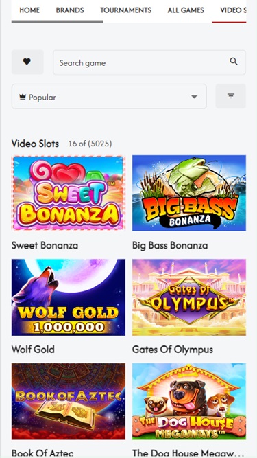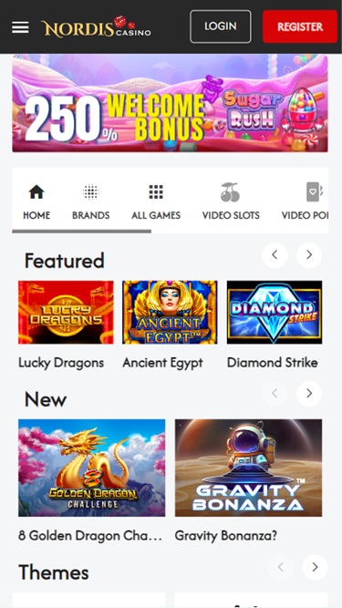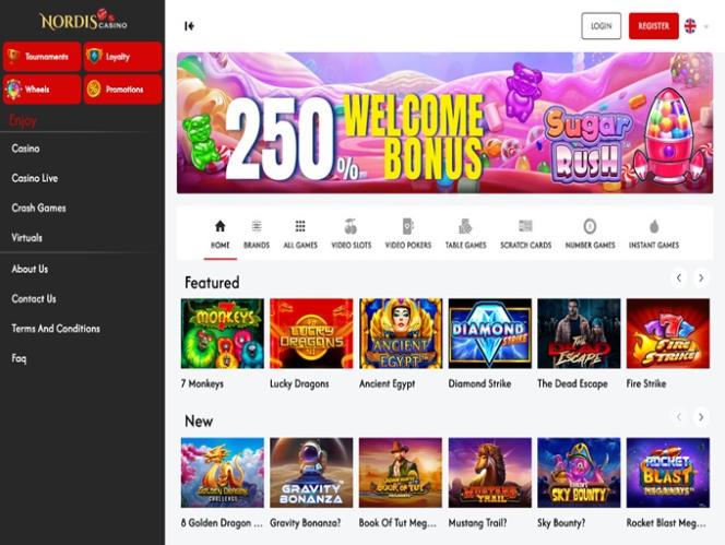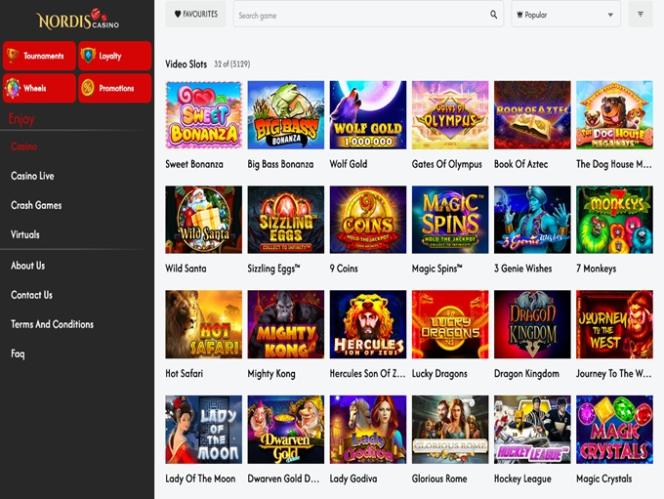 Nordis 提供的游戏分为多个类别,方便用户轻松浏览。赌场板块包括:热门老虎机、新游戏、累积奖金老虎机、桌面游戏、视频老虎机、视频扑克、刮刮卡、虚拟游戏和视频宾果游戏。此外,还提供真人荷官游戏。