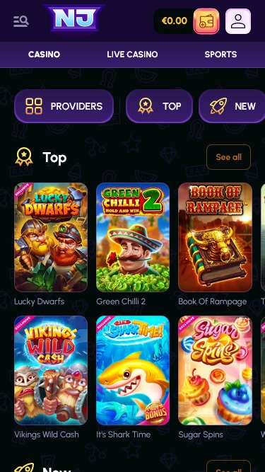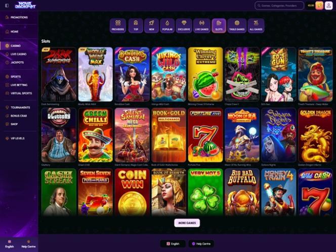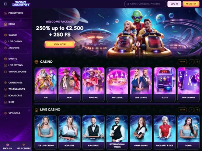 如前所述,Novajackpot 拥有一个现代化的平台,其所有内容结构极其完善。所有游戏分为三个部分:赌场、真人娱乐场和累积奖金。