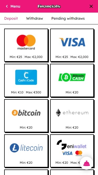 除了加密货币支付选项外,投注者还可以使用广泛接受的银行支付方式,包括所有类型的支付卡、直接转账和电子钱包。可用的支付方式因国家/地区而异。