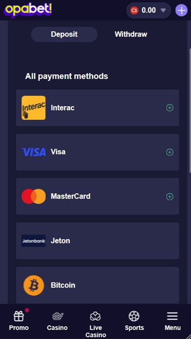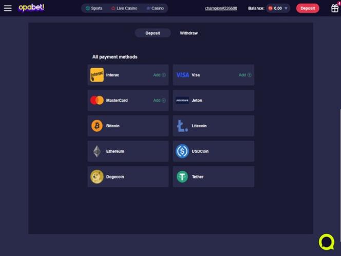Opabet 赌场接受传统和现代银行存款和取款方式,因此玩家拥有丰富的资金管理选择。传统方式包括Visa 、万事达卡、 Google Pay 、 Apple Pay 、银行电汇和Skrill 。而现代方式则包括比特币、狗狗币、以太坊、莱特币、瑞波币、 Solana 、 Toncoin 、 Tether和USD Coin等加密货币。