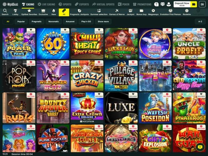 Optibet 赌场由 Microgaming, Net Entertainment, Playtech, 1x2gaming, Barcrest, Big Time Gaming, ELK Studios, Evolution Gaming, Habanero Systems, iSoftBet, lightningboxgames, Novomatic, Oryx, Play'n GO, playson, Quickspin, Rabcat, Relax Gaming, Thunderkick, Yggdrasil, Endorphina, Wazdan, Realistic Games, Betgames, Stakelogic, Pragmatic Play, Nolimit City, Felt Gaming, Red Tiger Gaming, IGT, Air Dice, Red Rake Gaming, Fantasma Games, FunFair, SYNOT Games, Kalamba, Platipus Gaming, Skywind, Triple Edge Studios, Northern Lights Gaming, Evoplay, Stormcraft Studios, Switch Studios, Electric Elephant Games, Pocket Games Soft, Bulletproof Games, All41 Studios, Gluck Games, Gameburger Studios, Pulse 8 Studios, Slot Factory, Neon Valley Studios, Golden Rock Studios, Spearhead Studios, Swintt, Shuffle Master, SpinPlay Games, HungryBear Gaming, Real Dealer Studios, GONG Gaming, Blue Guru Games, Lady Luck Games, On Air Entertainment, Buck Stakes Entertainment, Elysium Studios, Eurasian Gaming, Games Global, Amusnet Interactive, Wizard Games, Bally Technologies, Blueprint Gaming, EveryMatrix, Greentube, Leander Games, Merkur Gaming, NeoGames, NextGen, NYX Interactive, Pariplay, Push Gaming, Tom Horn Gaming, WMS, Inspired Gaming, Gaming Realms, SG Interactive, Gamomat, Red7Mobile, CORE Gaming, Scientific Games, Side City Studios, Reel Time Gaming, Authentic Gaming, BF Games, Bally Wulff, Iron Dog Studio, Old Skool Studios, Foxium, Betdigital, Just For The Win, Reflex Gaming, Storm Gaming Technology, PearFiction Studios, Wild Streak Gaming, Slingshot Studios, Fortune Factory Studios, Jade Rabbit Gaming, Green Jade Games, STHLM Gaming, RubyPlay, 4ThePlayer, AvatarUX, Gamevy, Crazy Tooth Studio, Pirates Gold Studios, ReelPlay, Japan Technicals Games, AGS Interactive, Alchemy Gaming, Snowborn Games, Boomerang Studios, Hacksaw Gaming, Max Win Gaming, Gold Coin Studios, Bang Bang Games, Half Pixel Studios, Arcadem, Slotmill, Peter And Sons, Eurostar Studios, Aurum Signature Studios, Armadillo Studios, Lucksome Gaming, FlipLuck, Area Vegas, RAW iGaming, Wishbone Games, Spribe, Circular Arrow, Print Studios, HammerTime Games, Four Leaf Gaming, INO Games, Nailed It! Games, Neko Games, Reel Kingdom, Oros Gaming, JVL, Light & Wonder and Kitsune Studios提供支持,赌场游戏可通过网页平台畅玩,这意味着您无需下载任何软件即可测试您的运气。该赌场还为希望在智能手机或平板电脑上玩游戏的玩家提供移动网站。