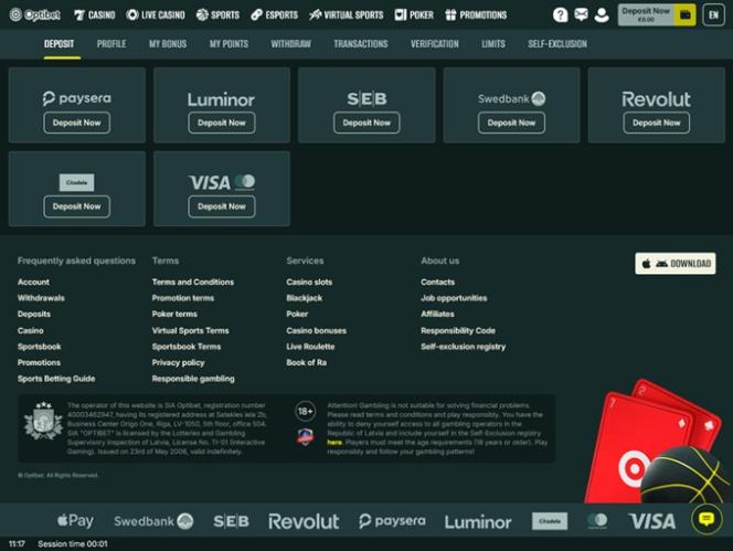 Optibet 是一个在线博彩网站,为客户提供全套博彩产品,包括体育博彩赌场和真人荷官平台。该赌场由 OPTIWIN OÜ 所有和运营,该公司总部位于爱沙尼亚,主要服务于欧洲博彩市场。自推出以来,Optibet 因其丰富的游戏库、公平的奖金条款和合理的派彩时间而广受玩家好评。