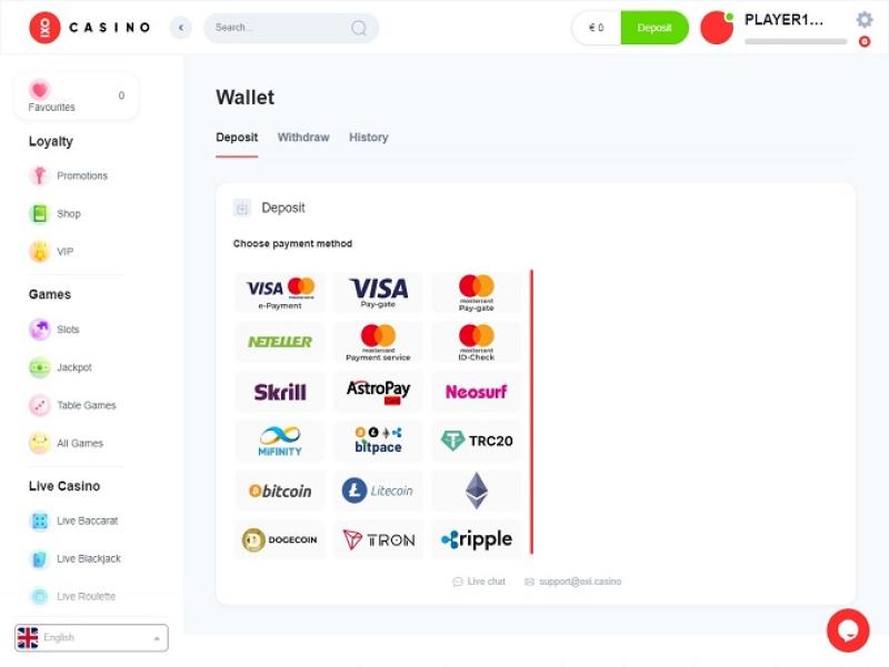 这是一个对加密货币友好的博彩品牌,也支持其他各种流行的银行存款和取款方式。在OXI,玩家可以使用借记卡、信用卡和预付卡、电子钱包和即时电汇。