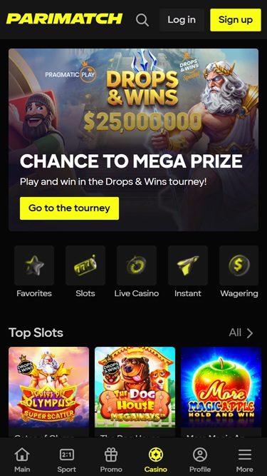 你会发现,该网站的所有游戏都通过浏览器提供,赌场则位于网站的独立标签页中。Parimatch 设计精良,易于操作,此外还设有搜索栏,方便你轻松找到特定游戏。赌场完全支持移动设备,因此你可以使用智能手机或平板电脑进行投注。