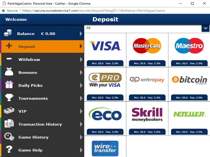 巴黎维加斯赌场由 NextGen and Skill on Net提供支持,其游戏通过可下载的软件以及允许通过网页浏览器进行游戏的即时游戏平台提供。移动玩家也可以通过智能手机和平板电脑访问赌场。Banking银⾏业务选项 的 Paris Vegas Casino