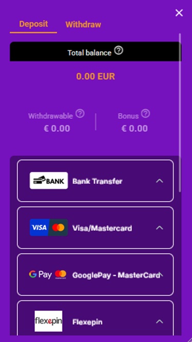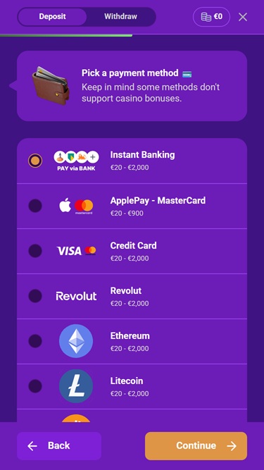 赌场的收银台提供各种传统和加密货币支付选项,包括Apple Pay 、银行电汇、Google Pay、热门信用卡和借记卡以及其他支付方式。在货币方面,您可以使用卡尔达诺 (Cardano)、比特币现金 (Bitcoin Cash)、比特币、狗狗币 (Dogecoin)、以太坊 (Ethereum)、莱特币 (Litecoin)、Solana、波场币 (Tron)、USD Coin、泰达币 (Tether) 和瑞波币 (Ripple) 进行存款和取款。此外,您还可以选择加元。