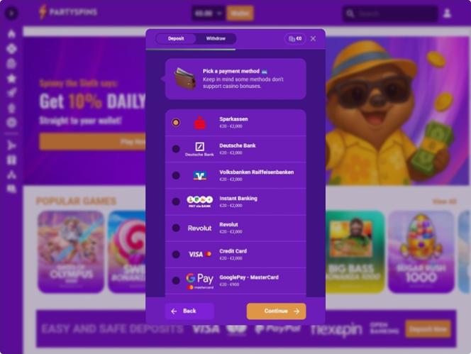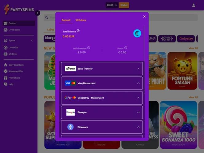 该平台左侧设有主菜单,包含以下类别:赌场、真人娱乐场、体育博彩、实时赔率、我的投注、每日返现、迎新优惠、促销活动和帮助。不过,与往常一样,要访问玩家控制面板,您首先需要创建一个帐户并加入 PartySpins 社区。注册流程分为四个步骤,但只需几分钟即可完成,您只需填写基本的个人信息即可。