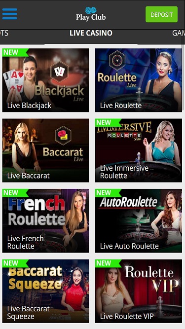 赌客们会在 Play Club 找到一个完整的真人荷官赌场,让您可以参与二十一点、轮盘赌等游戏的网络直播版本。