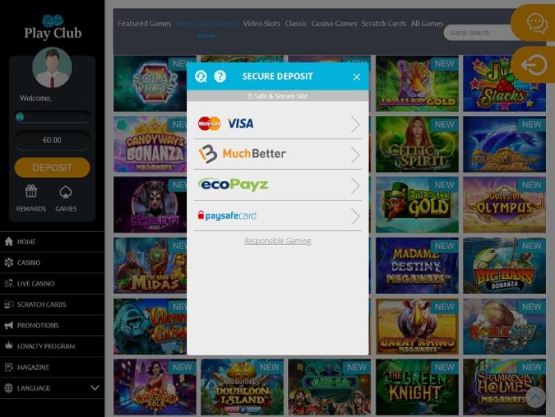下面您将看到 Play Club 的各种银行业务选项,包括存款和取款选择。
