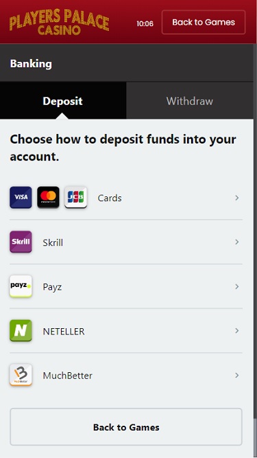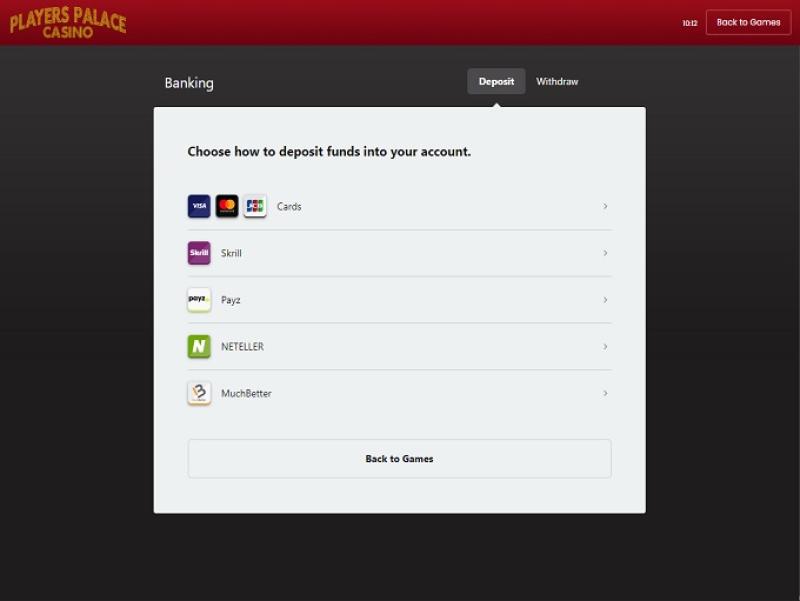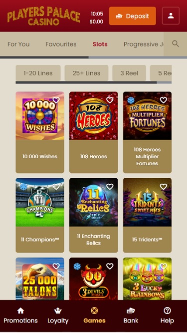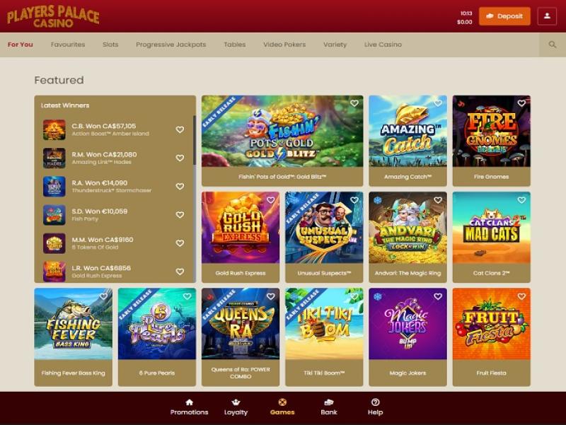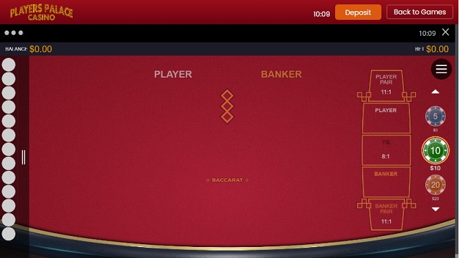 Players Palace 赌场由 Microgaming, Evolution Gaming, Rabcat, Pragmatic Play, Triple Edge Studios, Northern Lights Gaming, Stormcraft Studios, All41 Studios, Gameburger Studios, Pulse 8 Studios, Neon Valley Studios, SpinPlay Games, Real Dealer Studios, GONG Gaming, On Air Entertainment, Buck Stakes Entertainment, Games Global, Old Skool Studios, Foxium, Just For The Win, PearFiction Studios, Slingshot Studios, Fortune Factory Studios, Crazy Tooth Studio, Alchemy Gaming, Snowborn Games, Gold Coin Studios, Half Pixel Studios, Eurostar Studios and Aurum Signature Studios提供支持,为玩家提供超过 400 款游戏的丰富游戏库。该赌场提供可下载的客户端软件和网页平台两种访问方式。想要在智能手机和平板电脑上畅玩赌场游戏的玩家,可以通过 Players Palace 的移动网站进行访问。Baccarat
