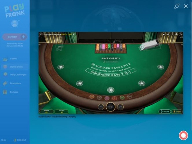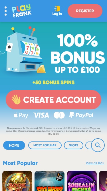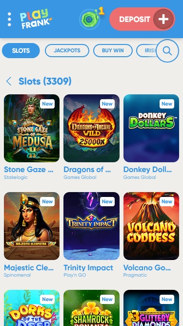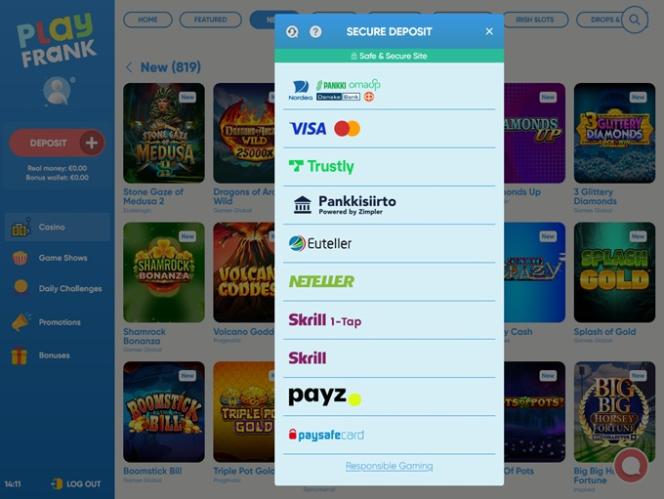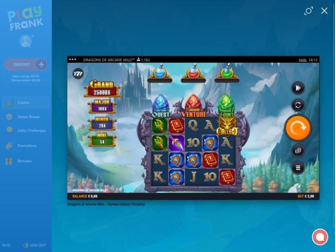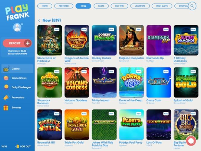 PlayFrank 赌场由 Amaya, Microgaming, Net Entertainment, BetSoft, 1x2gaming, Amatic Industries, Barcrest, Big Time Gaming, Evolution Gaming, EYECON, Ezugi, iSoftBet, lightningboxgames, Oryx, Play'n GO, playson, Quickspin, Rabcat, Yggdrasil, Wazdan, Realistic Games, Booming Games, Stakelogic, Pragmatic Play, GAMING1, Red Tiger Gaming, Spinomenal, Red Rake Gaming, Skillzzgaming, SYNOT Games, Skywind, Triple Edge Studios, Northern Lights Gaming, Stormcraft Studios, All41 Studios, Gluck Games, Gameburger Studios, Pulse 8 Studios, Neon Valley Studios, SpinPlay Games, GONG Gaming, Buck Stakes Entertainment, Games Global, Wizard Games, 2by2 Gaming, Ainsworth, Bally Technologies, bluberi, Blueprint Gaming, NextGen, Pariplay, Tom Horn Gaming, WMS, Inspired Gaming, Gaming Realms, SG Interactive, Gamomat, Scientific Games, Reel Time Gaming, betiXon, Bally Wulff, Old Skool Studios, Foxium, Betdigital, Just For The Win, PearFiction Studios, Wild Streak Gaming, Slingshot Studios, Fortune Factory Studios, RubyPlay, AvatarUX, Gamevy, Crazy Tooth Studio, High 5 Games, ReelPlay, Alchemy Gaming, Snowborn Games, Hacksaw Gaming, Bang Bang Games, Slotmill, Lucksome Gaming, Area Vegas, Leap Gaming, Wishbone Games, Spribe and HammerTime Games提供支持,这使其拥有庞大的游戏库,并通过赌场的网络平台提供。移动网站也允许玩家通过智能手机和平板电脑玩游戏。