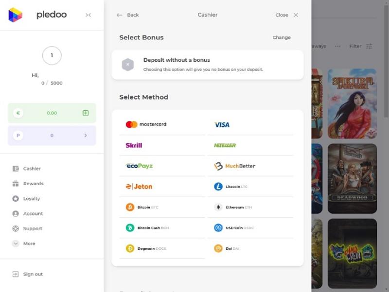Pledoo 为所有新账户用户提供前四次存款的丰厚迎新礼包。已注册会员可享受充值奖励。此外,如果用户选择使用加密货币为账户充值,还可获得加密货币奖励。