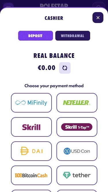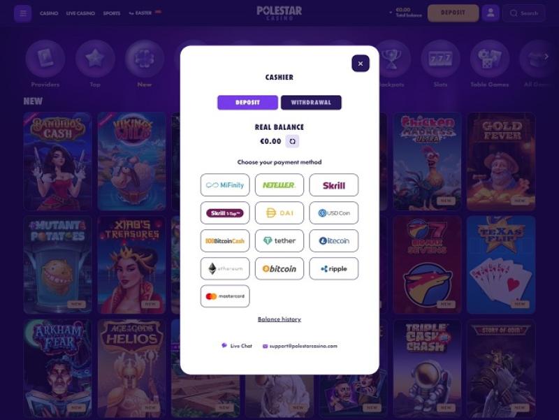 Polestar Casino 支持多种支付方式,玩家可根据需要进行存款和取款。他们可以选择多种知名的银行服务,例如信用卡、借记卡、 Neteller 和 Skrill ,以及其他值得信赖的电子钱包和在线支付系统等等。此外,运营商还为喜欢使用数字货币进行博彩的玩家提供了加密货币银行服务。