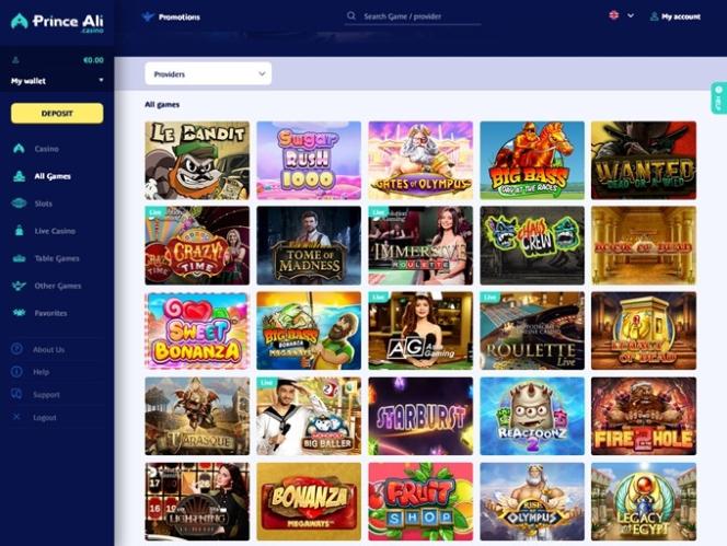 PrinceAli 拥有众多业内知名游戏供应商。与巨头合作通常能保证最高的内容质量和游戏类型的多样性。