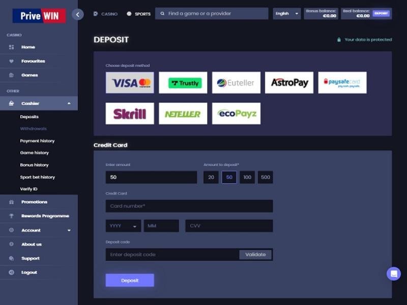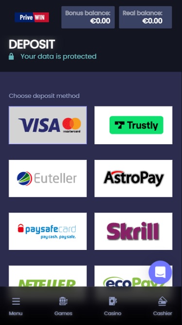 Prive Win Casino 的出纳员提供了多种支付方式,玩家可以通过可靠的银行选项、在线支付系统和加密钱包存入和提取资金: