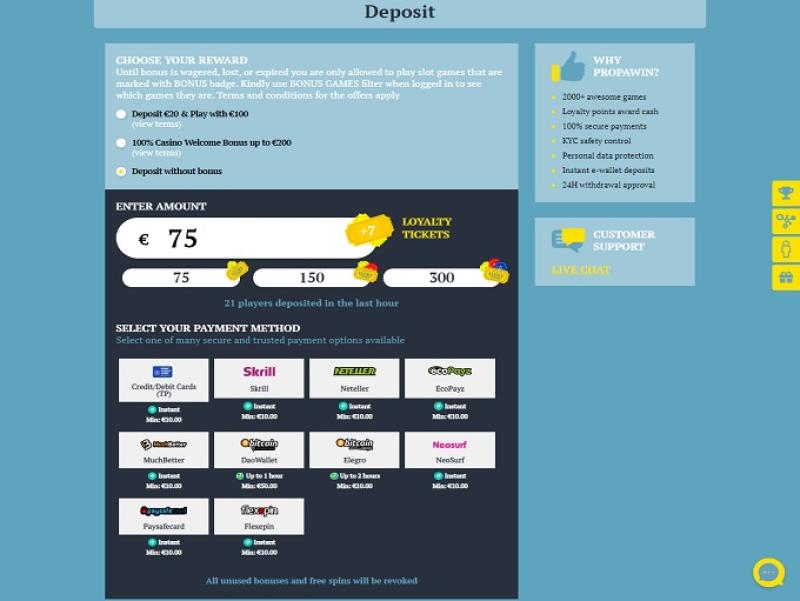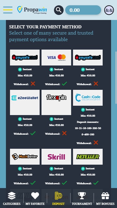 仔细查看PropaWin赌场的条款和条件,该网站的运营方式似乎没有任何掠夺性或不公平之处。PropaWin赌场的银行系统多种多样,允许通过Skrill和Moneybookers进行存款和取款,但也可以使用比特币、万事达卡、Visa、美国运通卡、Paysafecard、iDeal和Trustly进行存款。赌场的电子钱包支付时间最长可能需要三个工作日,而电汇支付时间最长可能需要五个工作日。